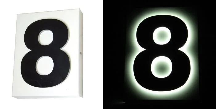 Świecące cyfry na budynki to odmiana kasetonów, stanowiąca białą bazę z umieszczonymi na niej przestrzennymi cyframi, podświetlanymi z efektem halo. Oznacza to, że same cyfry mają kolor ciemny i wydobywa się spod nich światło, które podświetla tło wokół nich delikatnym światłem w formie poświaty, nadając elewacji unikalny klimat.